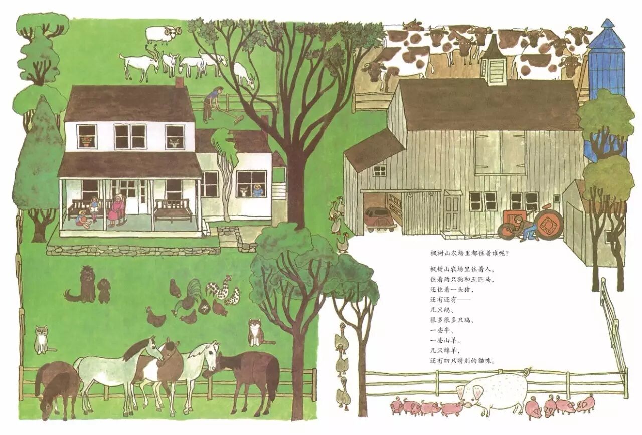 这是书一开始枫树山农场的定格照。清新、明快又有点优雅的水彩,把这个农场小庄园描绘得郁郁葱葱,井然有序,令人心旷神怡。 “枫树山农场里都住着谁呢?枫树山农场里住着人,住着两只狗和五匹马,还住着一头猪,还有还有——几只鹅、很多很多只鸡、一些牛、一些山羊、几只绵羊,还有四只特别的猫咪。”农场主人像跟远道而来的客人话家常一样,将农场里动物们的拉拉杂杂一一道来。