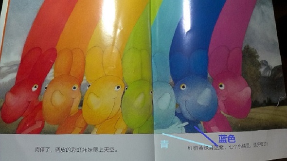 《颜色的秘密》孩子2岁时就简单共读过几次,当时没读出什么,现在孩子四岁了,晚上拿出来和她重读,孩子发现了几个问题,有的我都不知道怎么解释。请先看下面故事的第一页和第二页,请注意“青色”是哪个色?