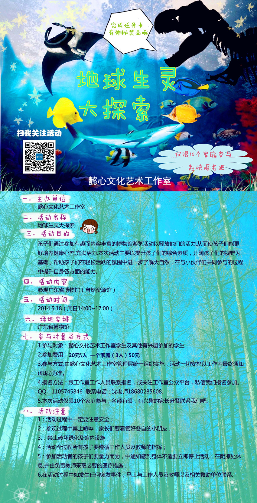 大自然的鬼斧神工创造了多少你无法想象的奇迹,古老的恐龙、海洋生物、植物等等,期待深入了解它们吗?任务式的探索之旅等你来挑战!5月18号懿心与您相约广东省博物馆,有兴趣有兴趣的家长赶快报名参加吧!